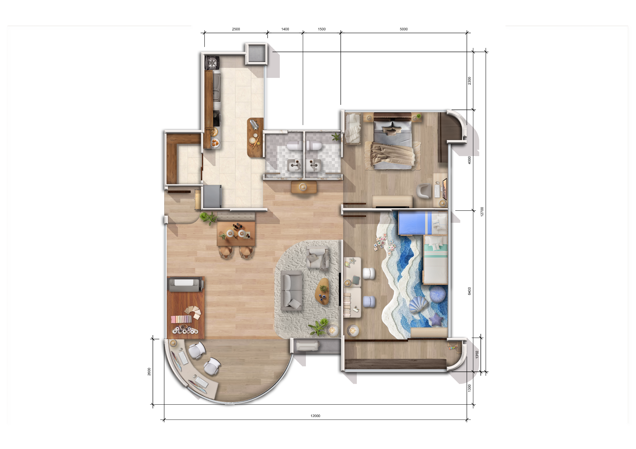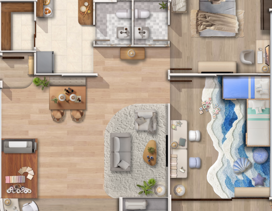 The final render was done in Photoshop, and sees some elements changes or rearranged based on feedback received. Furnishings were chosen to best match client needs and preferences.